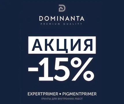 Условия акции:Скидка 15% на профессиональный грунт ExpertPrimer и PigmentPrimer от Dominanta! Подготовьте стены и потолки к окраске с идеальным результатом. Акция действует до 30 апреля во всех магазинах «Мир Красок» и на сайте dominantapaints.ru.