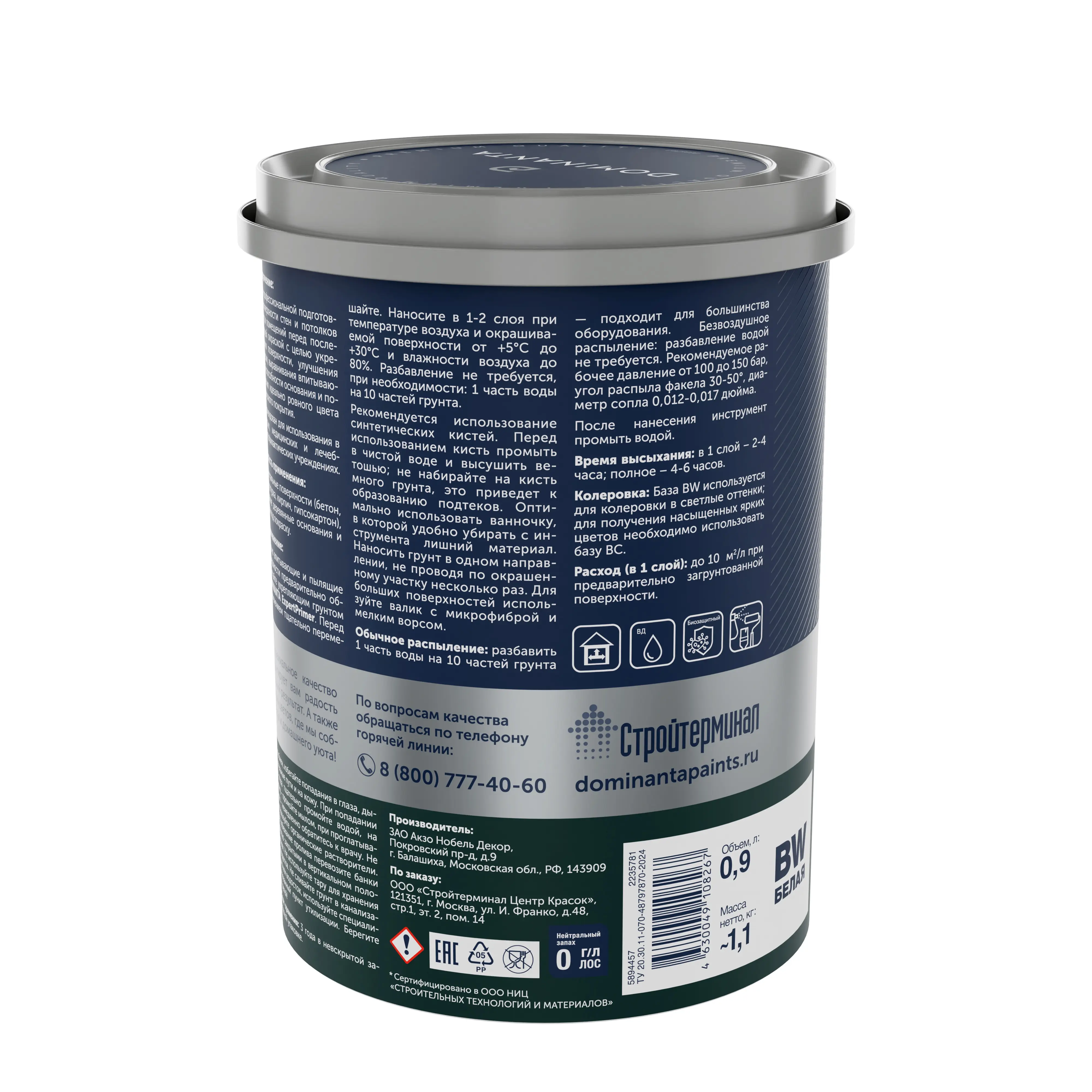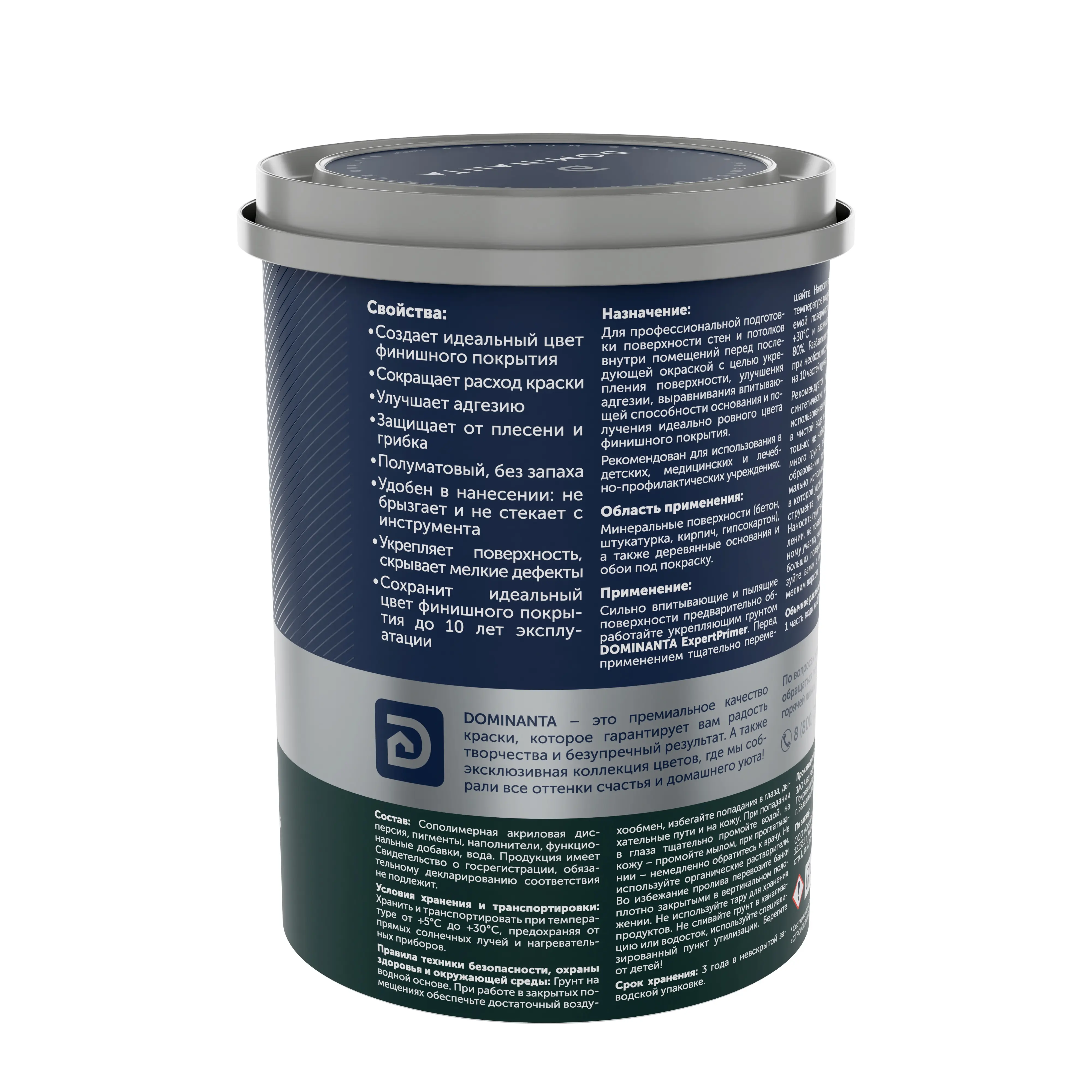 Сильно впитывающие и пылящие поверхности предварительно обработайте укрепляющим грунтом DOMINANTA ExpertPrimer. Перед применением тщательно перемешайте. Наносите в 1-2 слоя при температуре воздуха и окрашиваемой поверхности от +5°С до +30°С и влажности воздуха до 80%. Разбавление не требуется, при необходимости: 1 часть воды на 10 частей грунта.