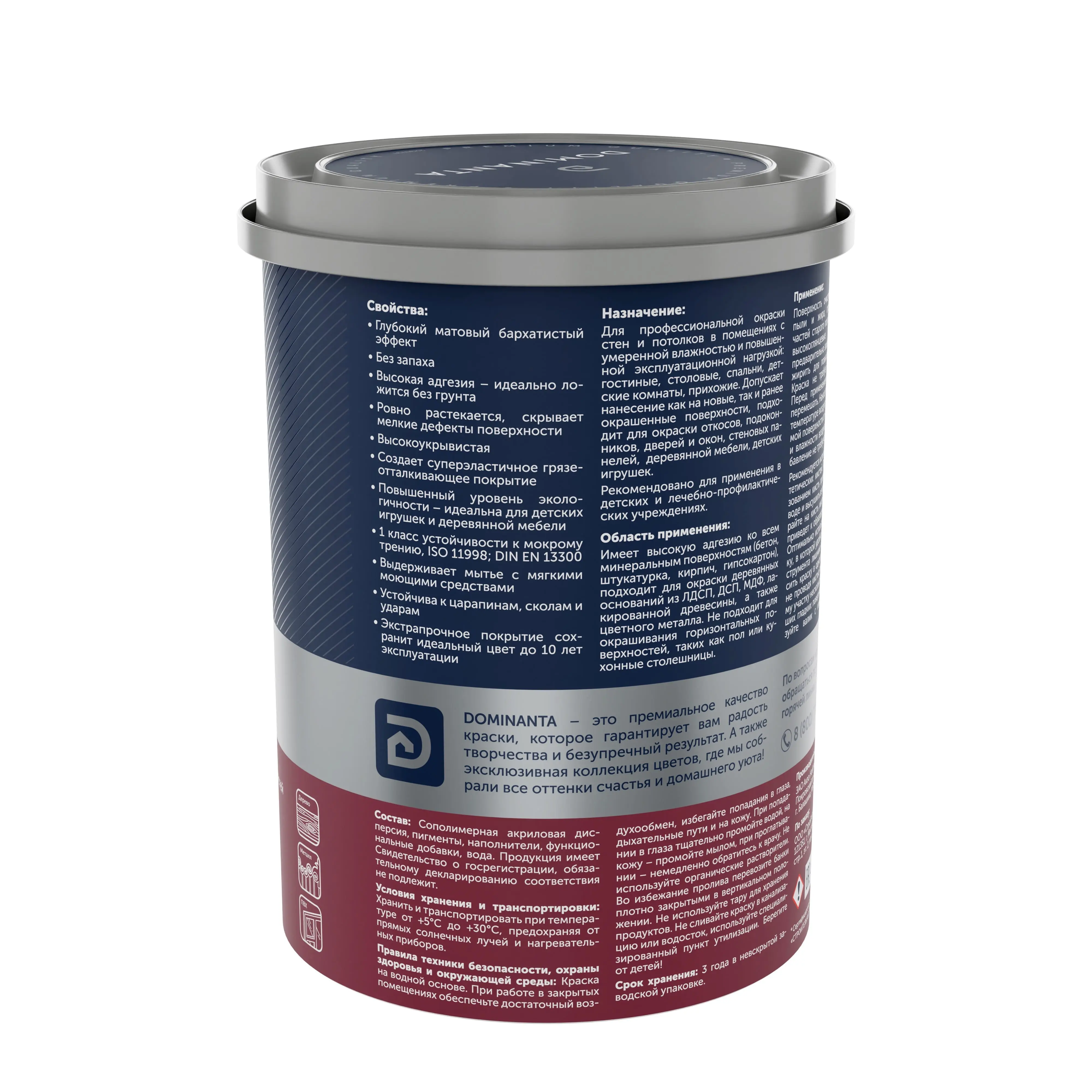 Краска интерьерная многофункциональная, экстрапрочная, матовая. Подходит для окраски откосов, подоконников, дверей и окон, стеновых панелей, деревянной мебели, детских игрушек. Имеет высокую адгезию ко всем минеральным поверхностям, подходит для окраски деревянных оснований из ЛДСП, ДСП, МДФ, лакированной древесины, а также цветного металла. Не требует предварительного грунтования. Суперэластичное моющееся грязеооталкивающее покрытие. Устойчива к царапинам, сколам и ударам.