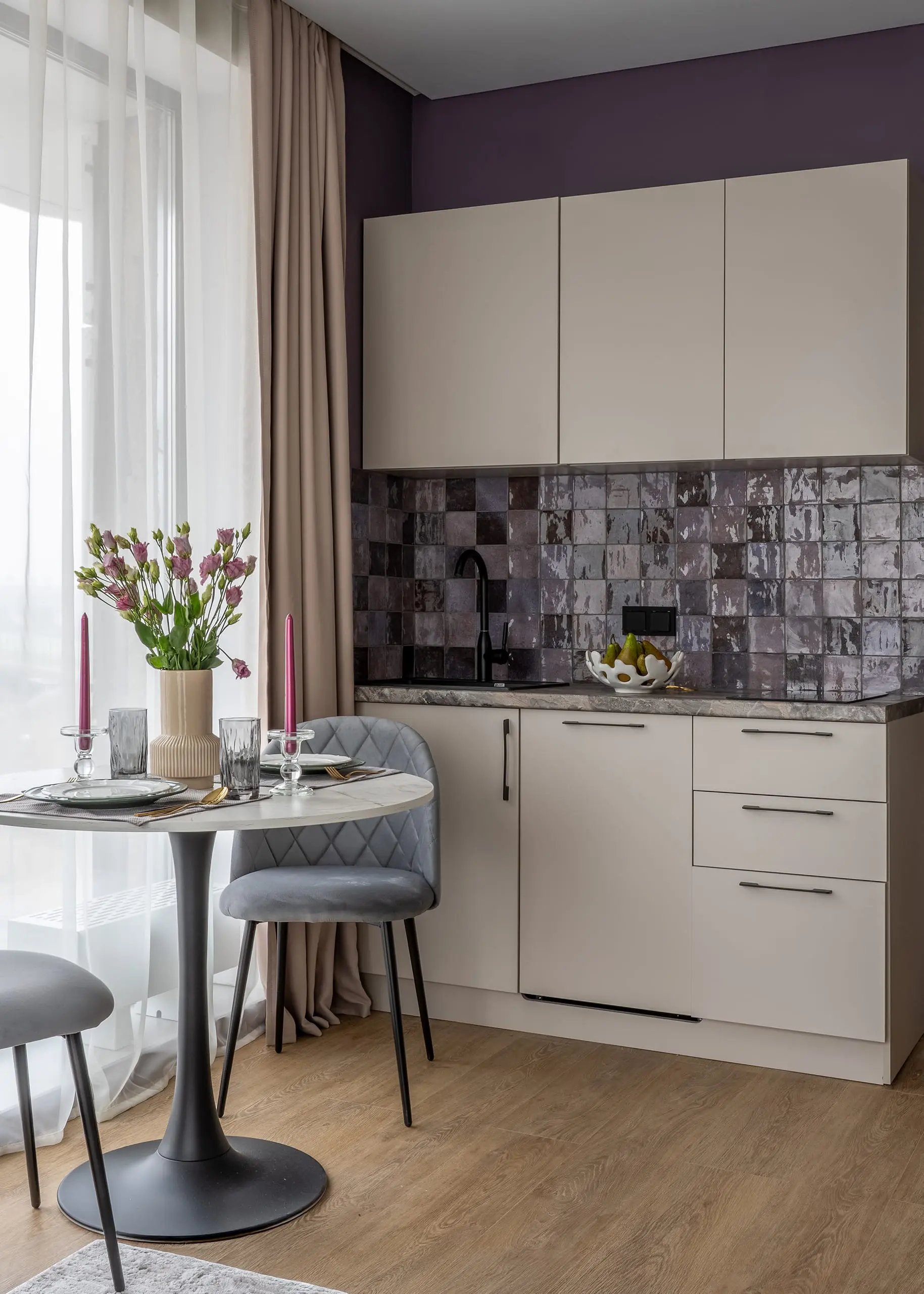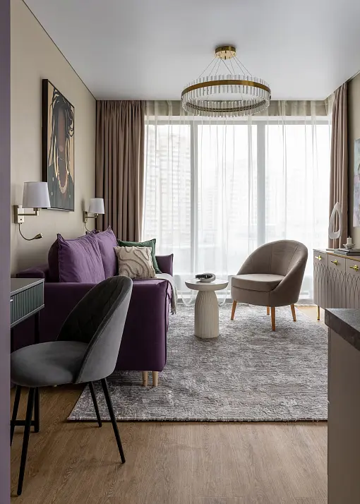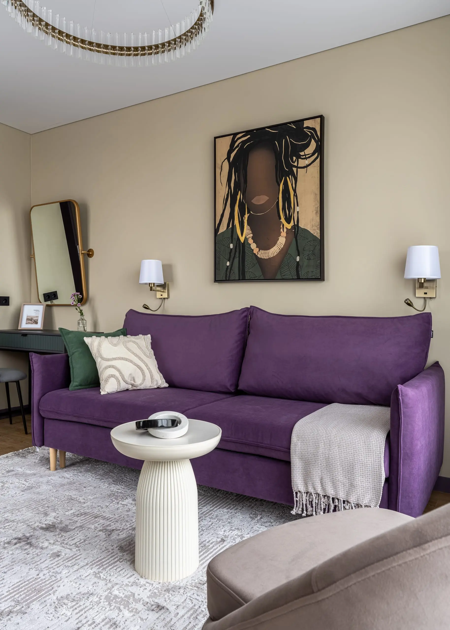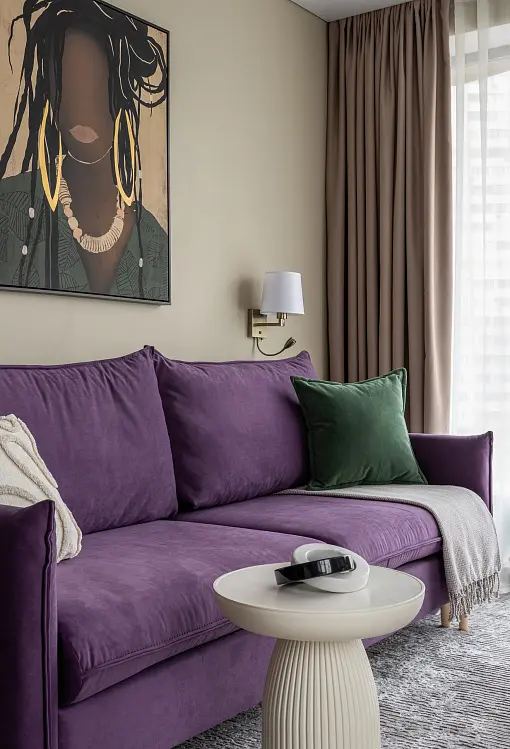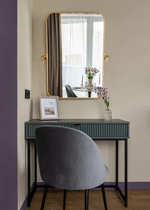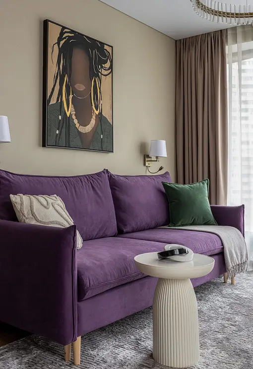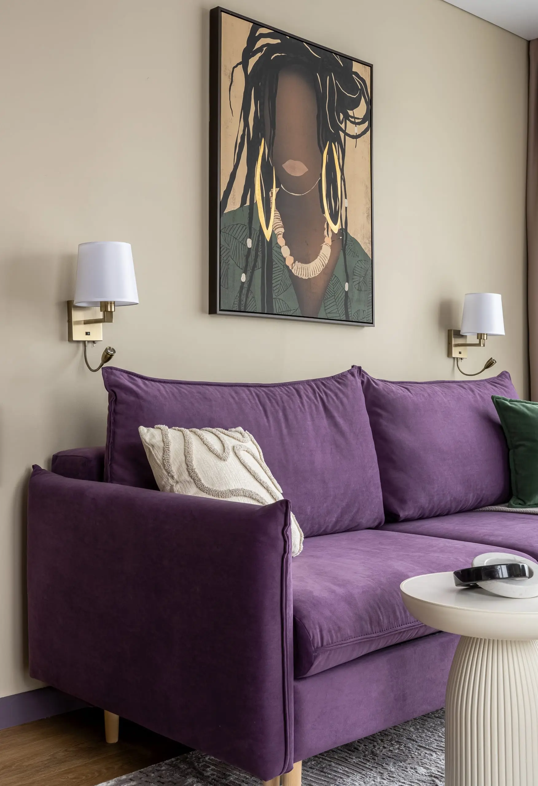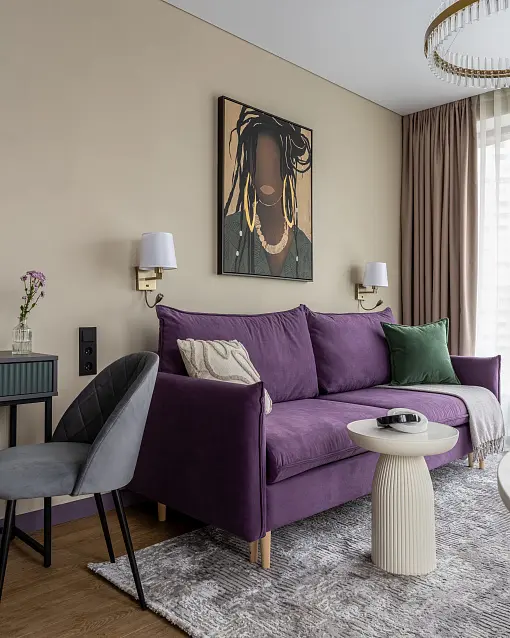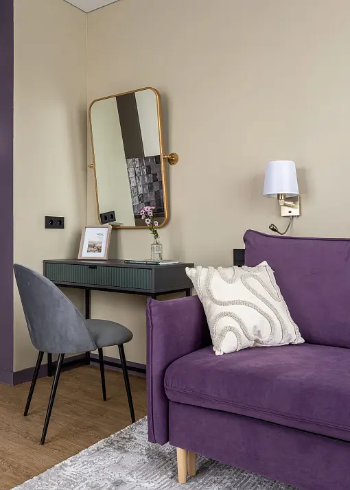 Использован для основной комнаты. Он создаёт спокойный и мягкий фон, идеально сочетающийся с насыщенным аметистовым акцентом. Для стен в комнате использована краска ColorFusion— с глубокоматовым покрытием, антибликовым эффектом и отличной укрывистостью. Это интерьерная линейка премиальных красок Dominanta.