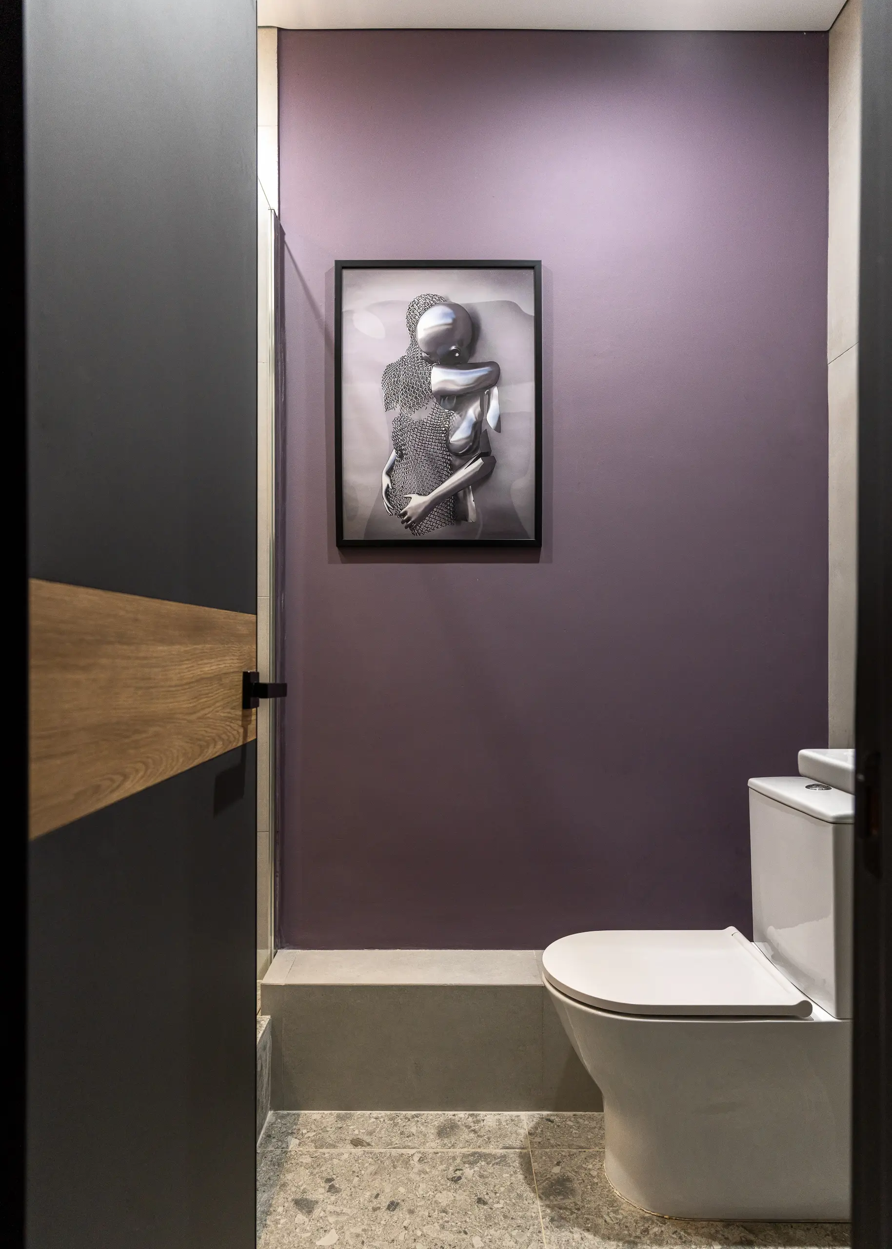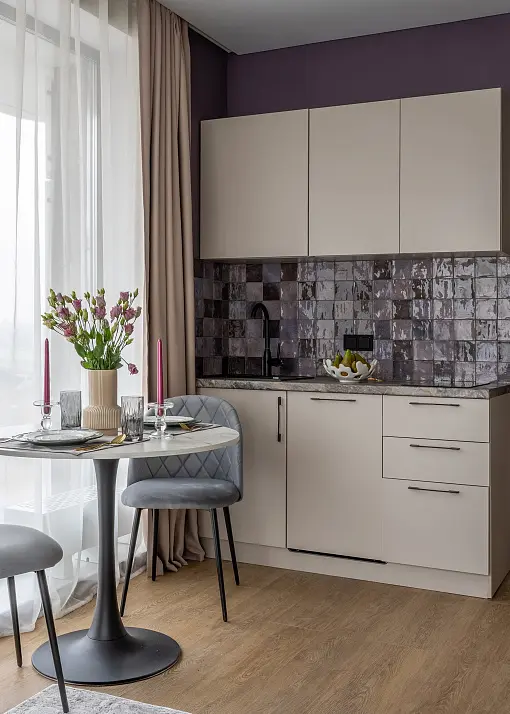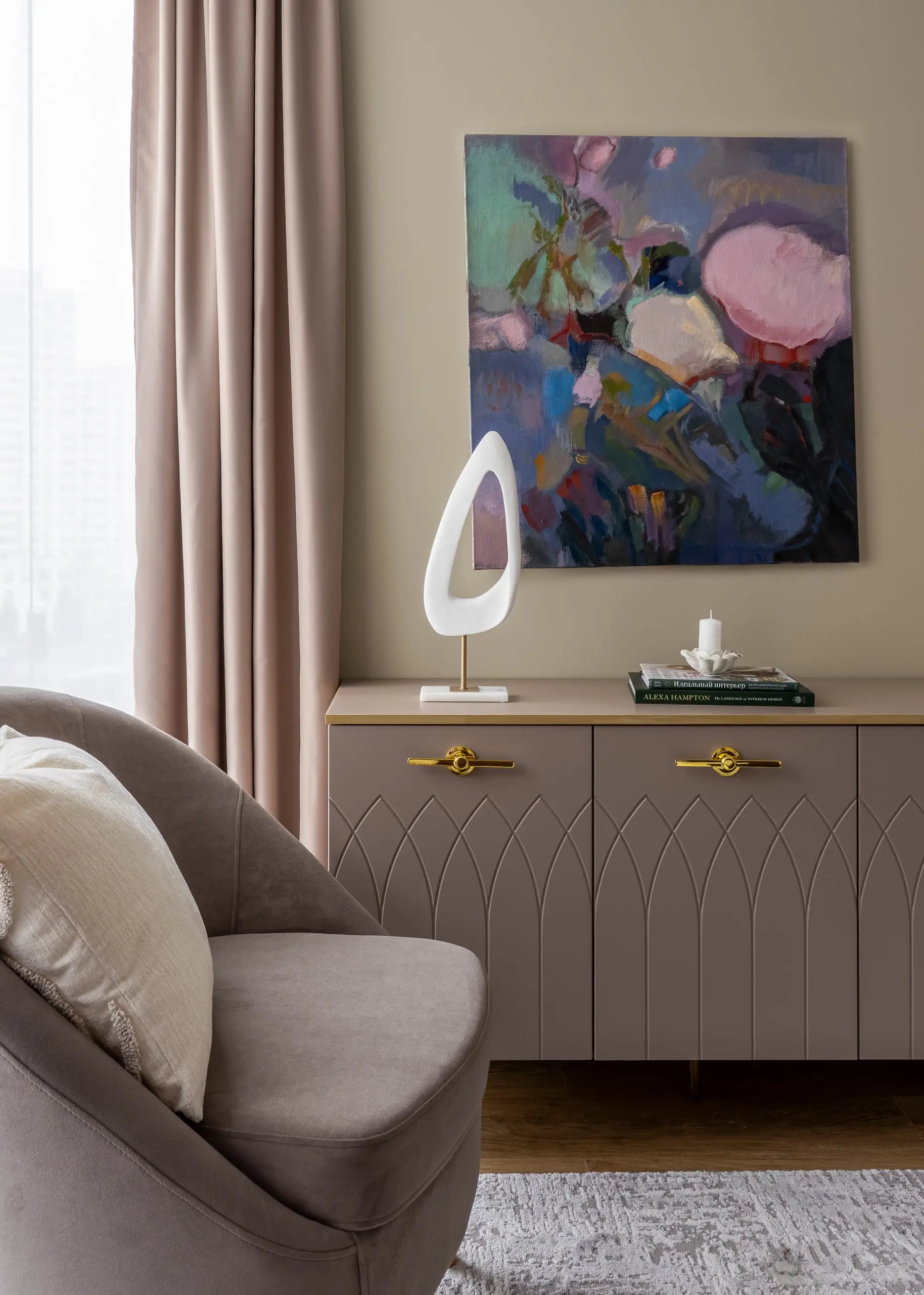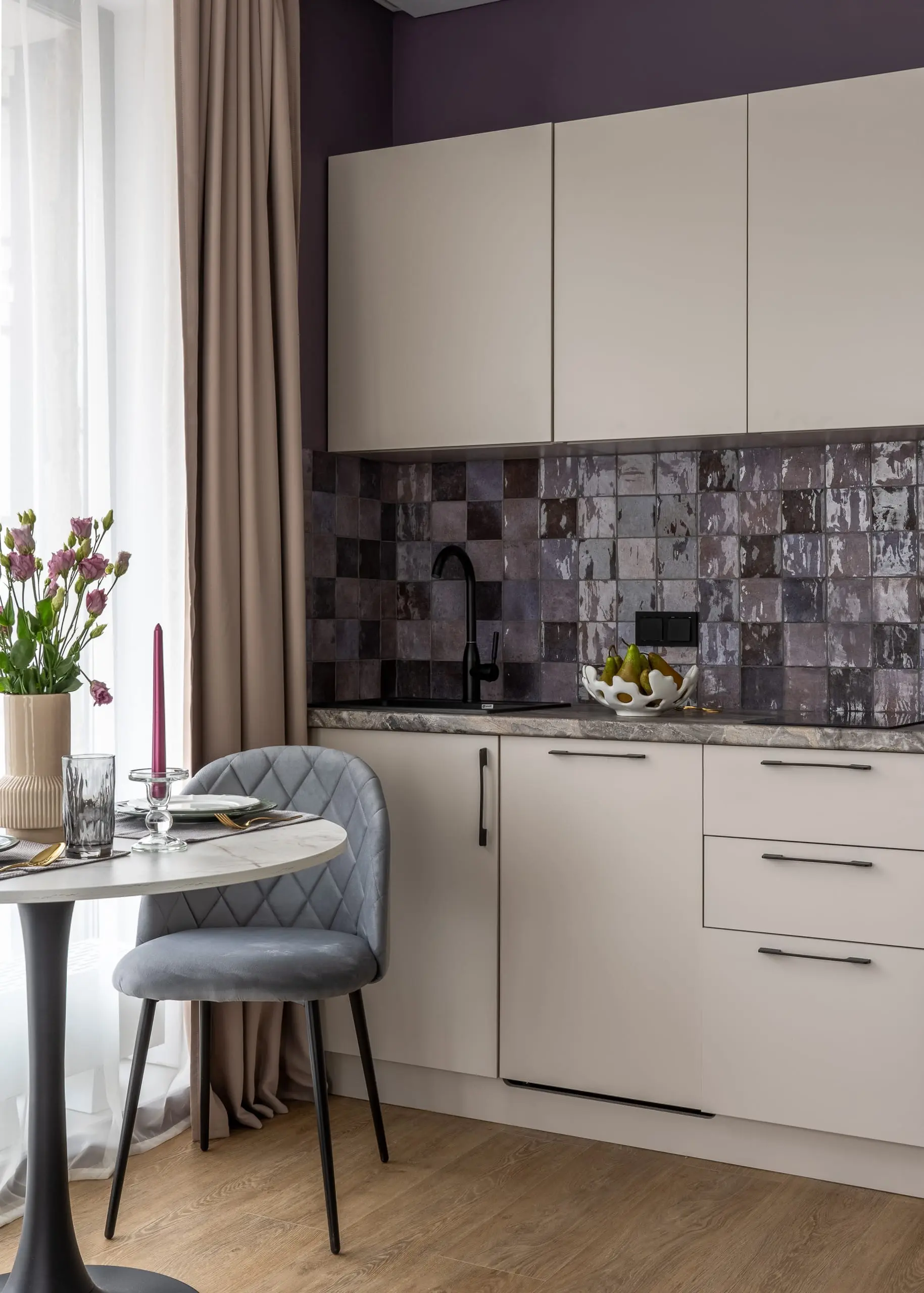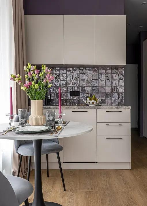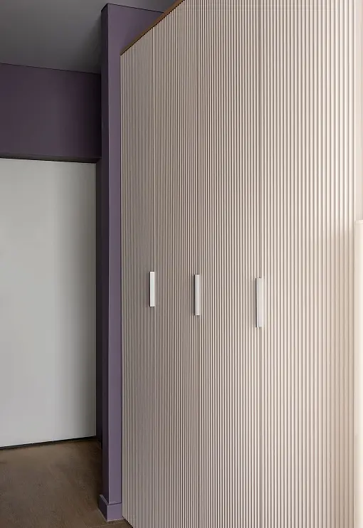 Использован для основной комнаты. Он создаёт спокойный и мягкий фон, идеально сочетающийся с насыщенным аметистовым акцентом. Для стен в комнате использована краска ColorFusion— с глубокоматовым покрытием, антибликовым эффектом и отличной укрывистостью. Это интерьерная линейка премиальных красок Dominanta.