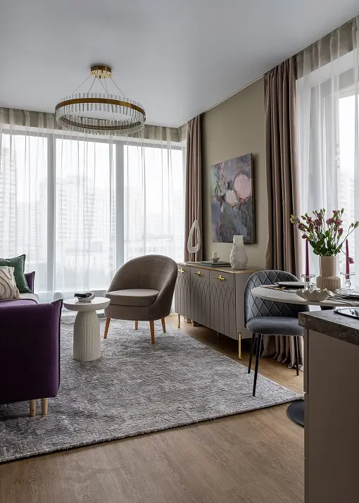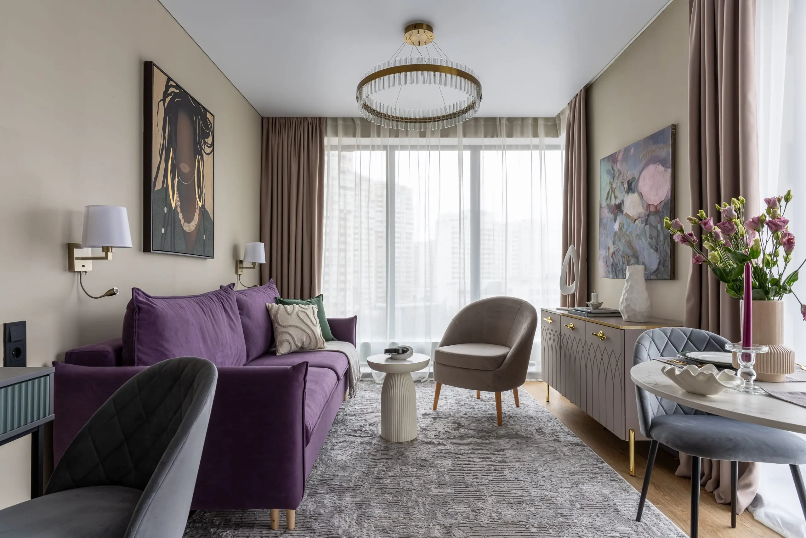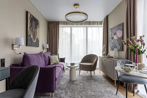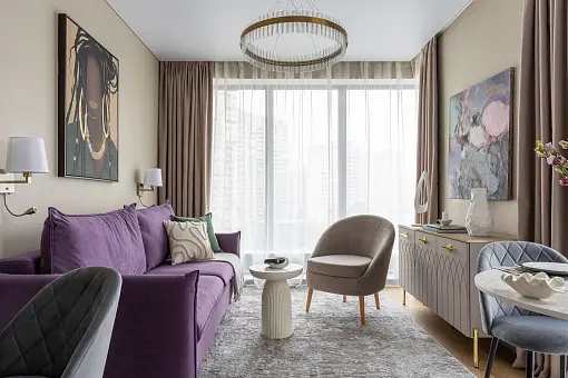 Пожелание заказчика: отразить в проекте название жилого комплекса — «Аметист». Поэтому основной акцент был сделан на цветовую палитру с оттенками аметиста.