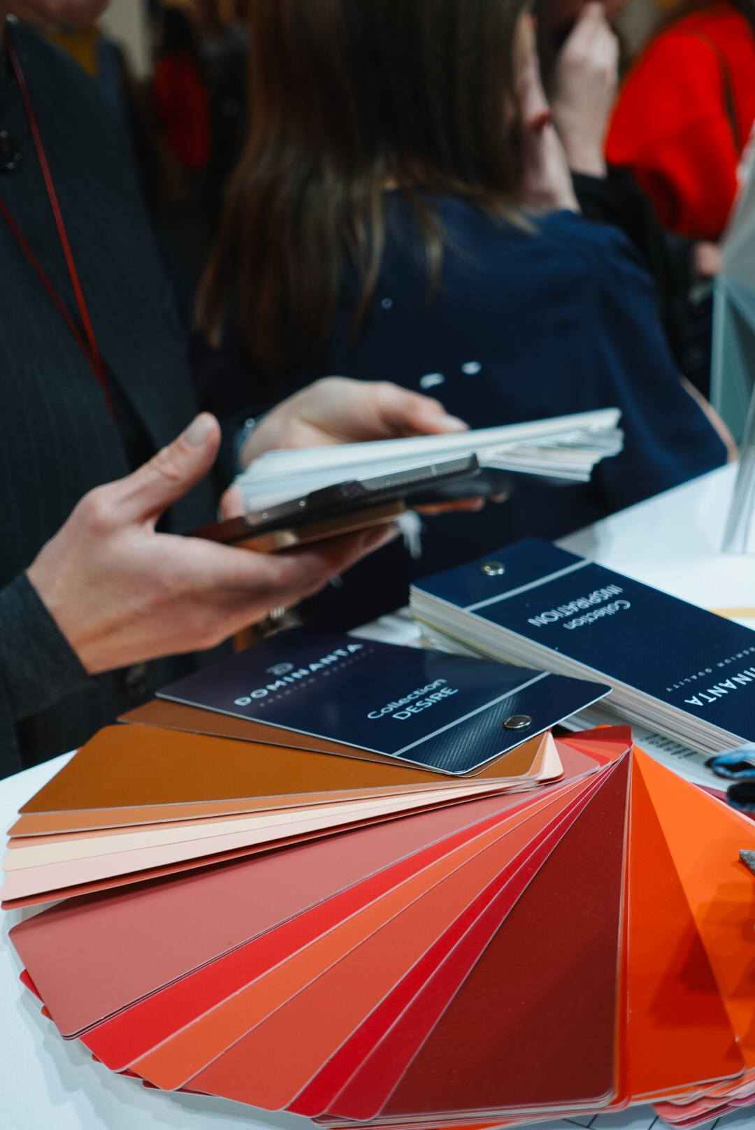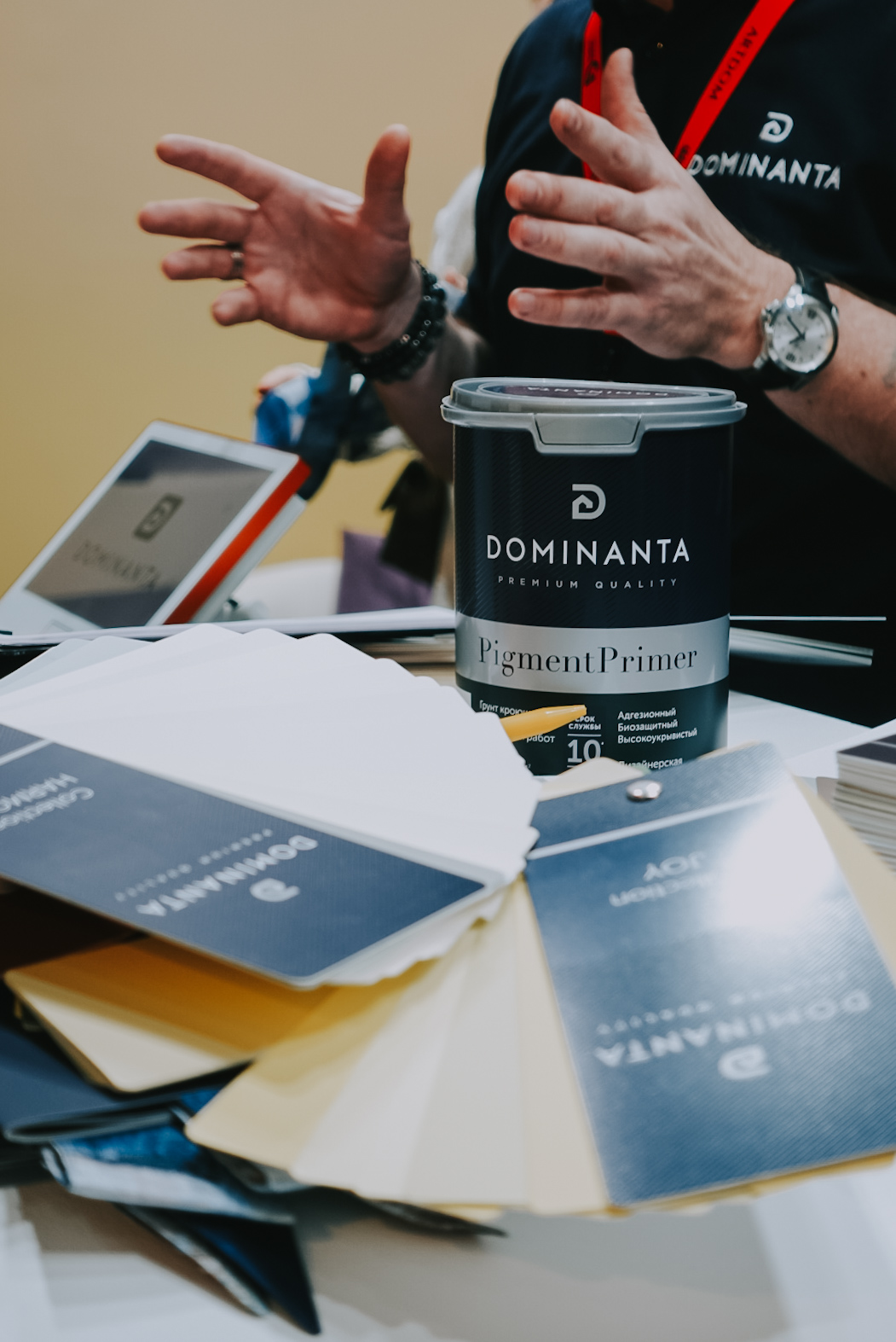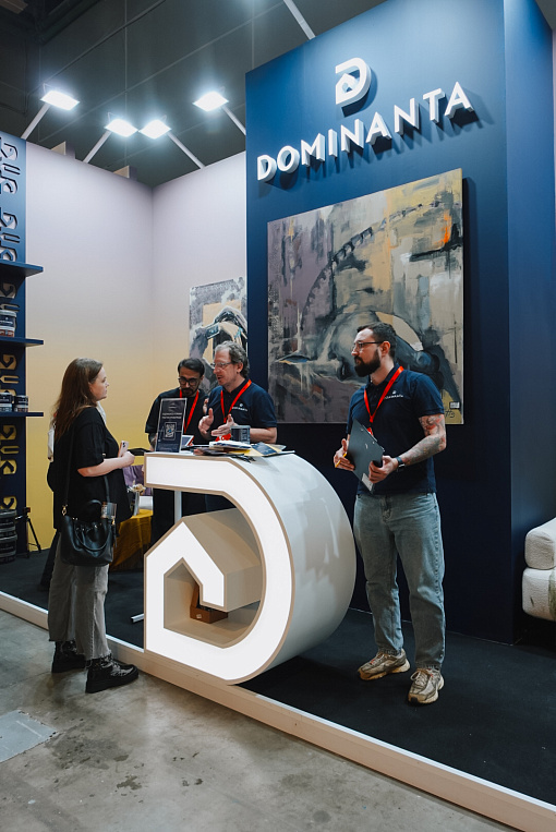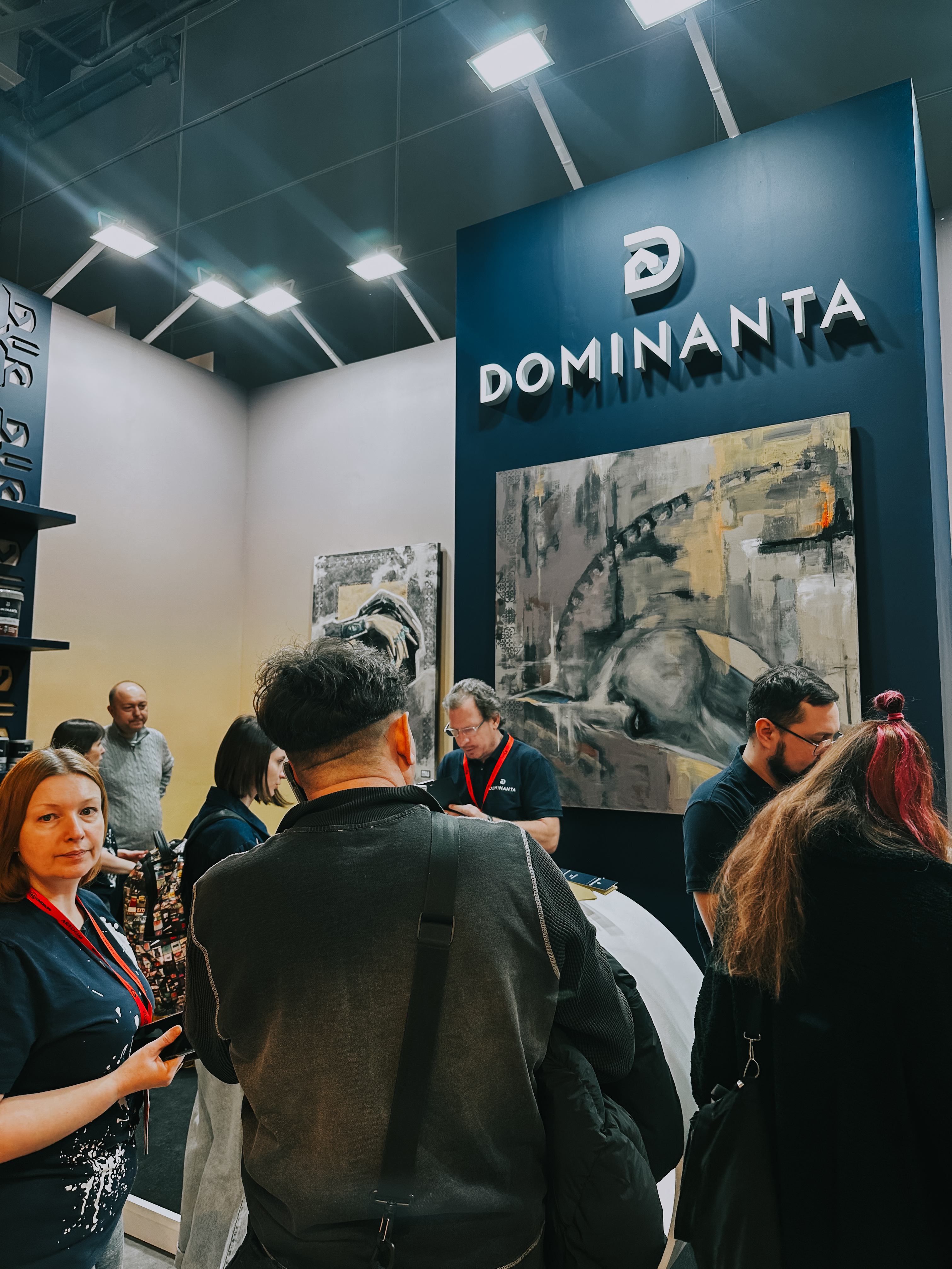 Главным акцентом стенда DOMINANTA стали работы художника Гамлета. Для создания серии художник использовал оттенки из палитры «Арабский вечер». И эти же глубокие, благородные тона полностью определили облик нашего пространства. Получился не просто стенд, а цельная история о том, как цвет задает настроение и формирует впечатление.