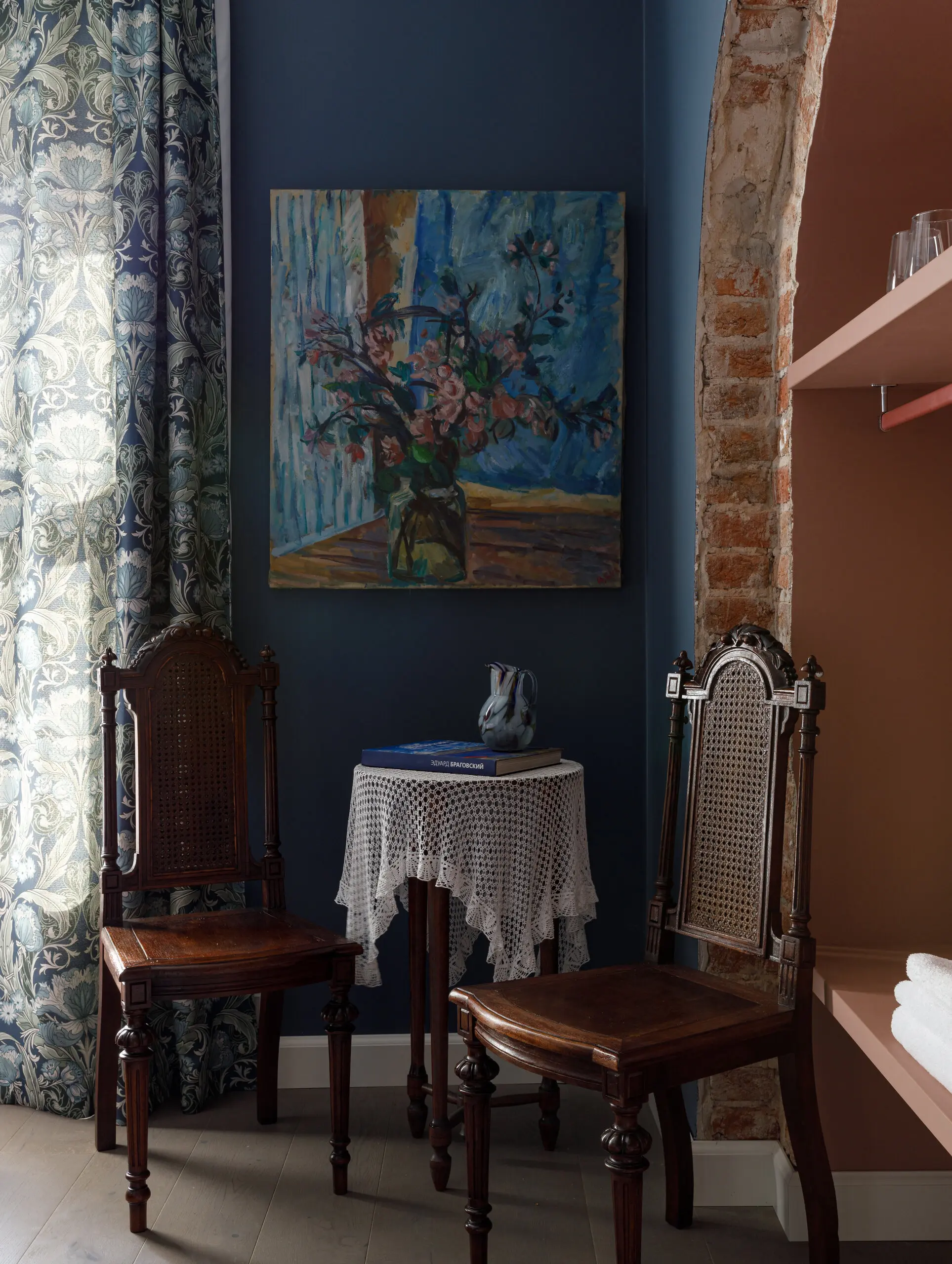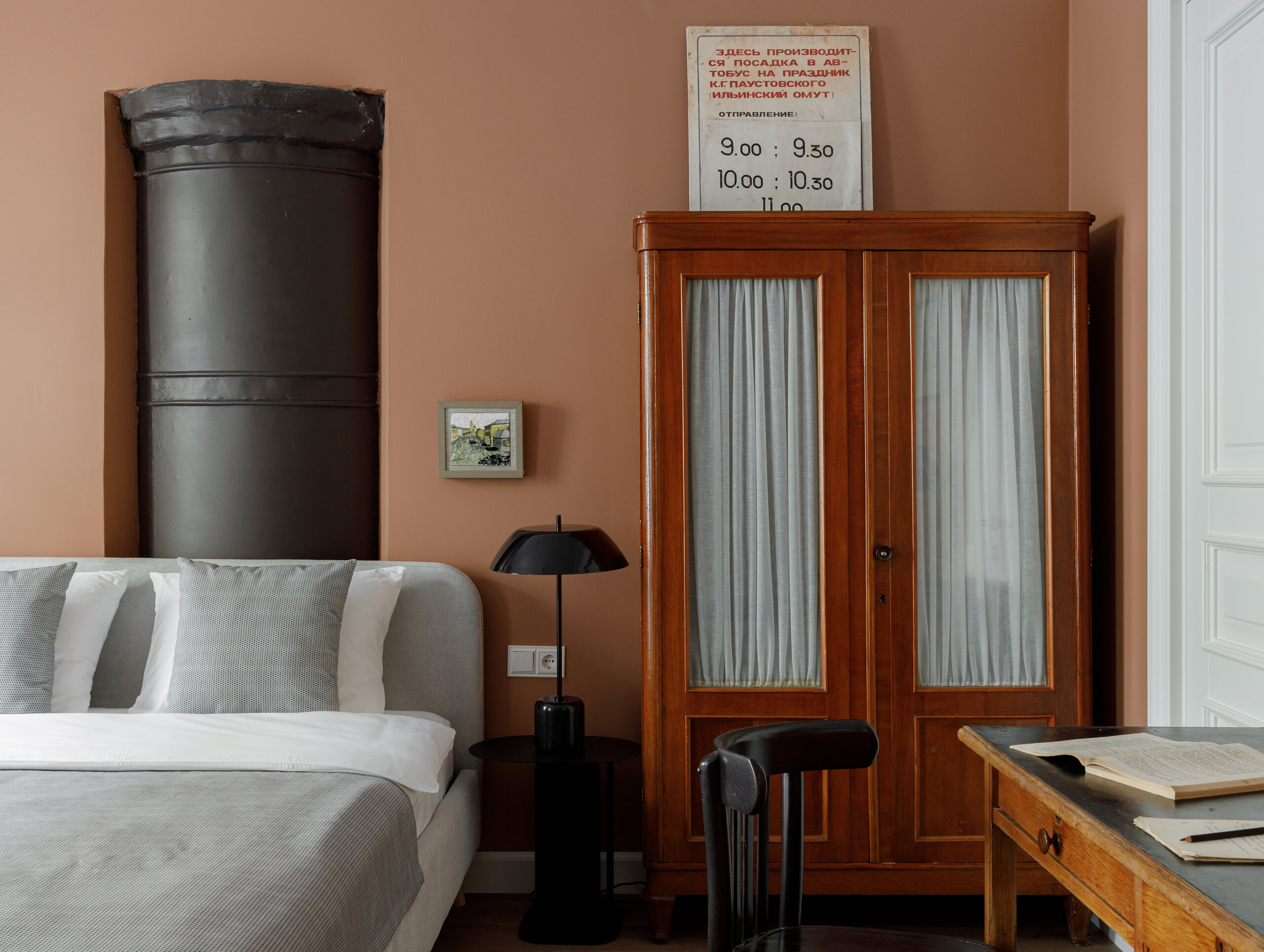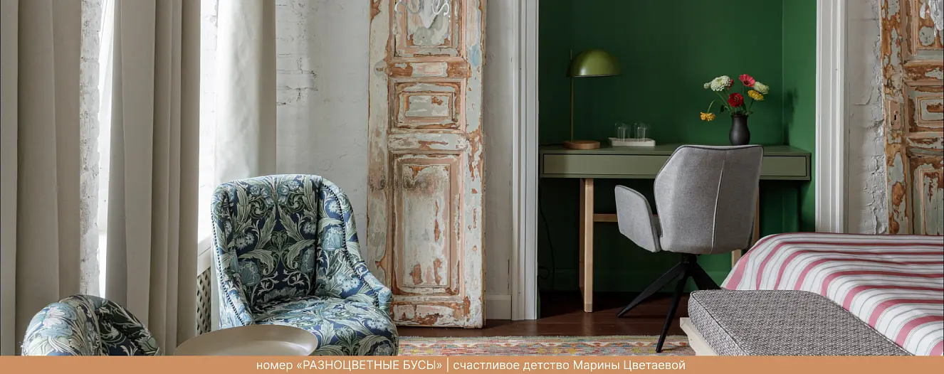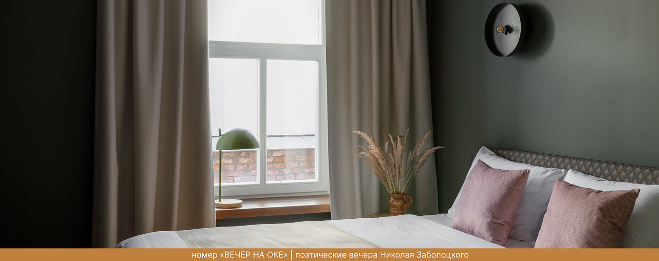 Евгения поставила перед собой задачу не просто отреставрировать здание, а оживить дух Тарусы — города, который на протяжении веков вдохновлял поэтов, художников и музыкантов. Так родилась идея десяти уникальных номеров, каждый из которых посвящен творчеству выдающихся «тарусских дачников». Это читается в тщательно подобранных цветовых палитрах, мебели и декоре.