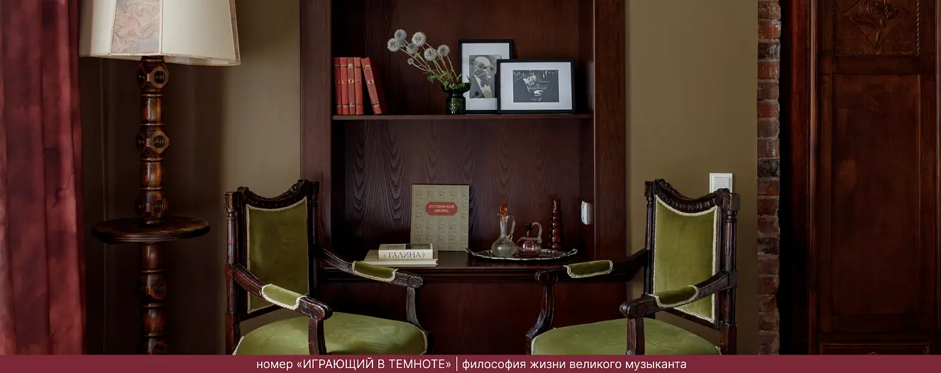 Интерьер вдохновлен историей жизни и творчества великого пианиста и построен на игре света и тени. Рихтер был убежден, что для глубокого восприятия музыки не нужны визуальные образы, поэтому просил погружать зал в полную темноту, оставляя лишь свет над клавишами. Этот номер обволакивающий и уютный, и одновременно сдержанный, и строгий, как и интерьер самого Рихтера на Большой Бронной.